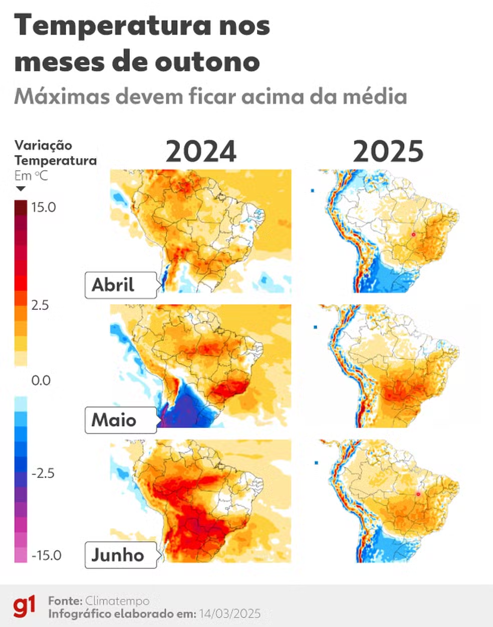通常,秋季是从夏季向冬季过渡的时期,巴西内陆地区降雨较少,气温适中。但根据Climatempo(巴西气象机构)的预测,2025年秋季的降雨量将处于正常范围,而气温则高于往年同期的平均水平(详见下方地图)。