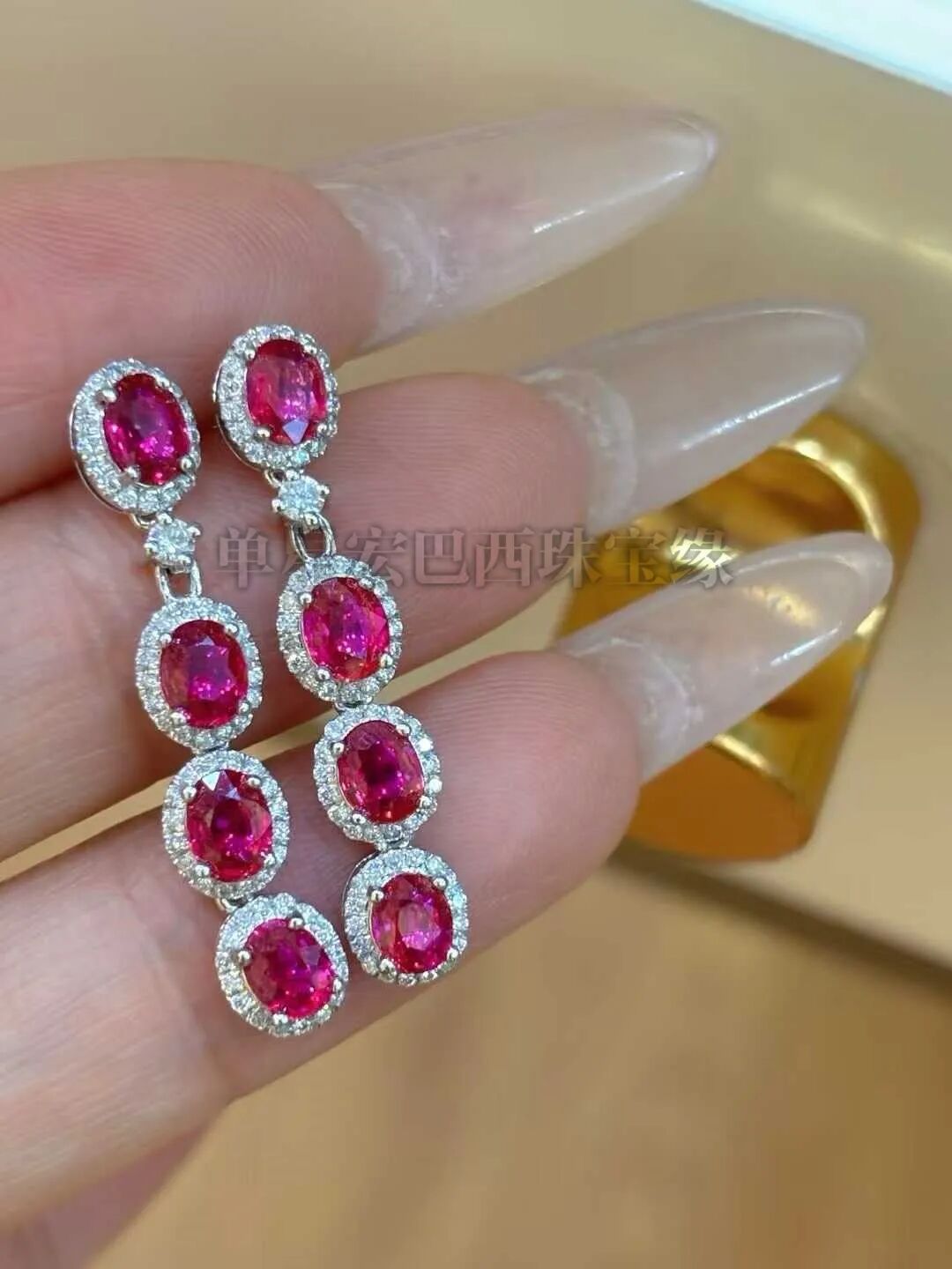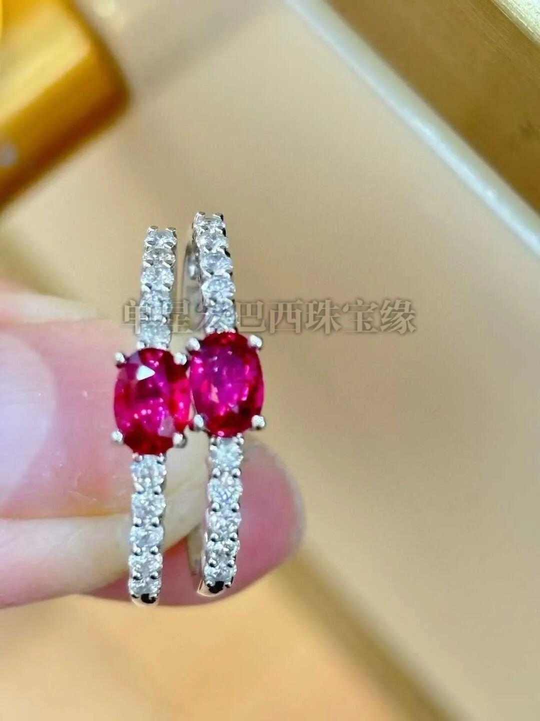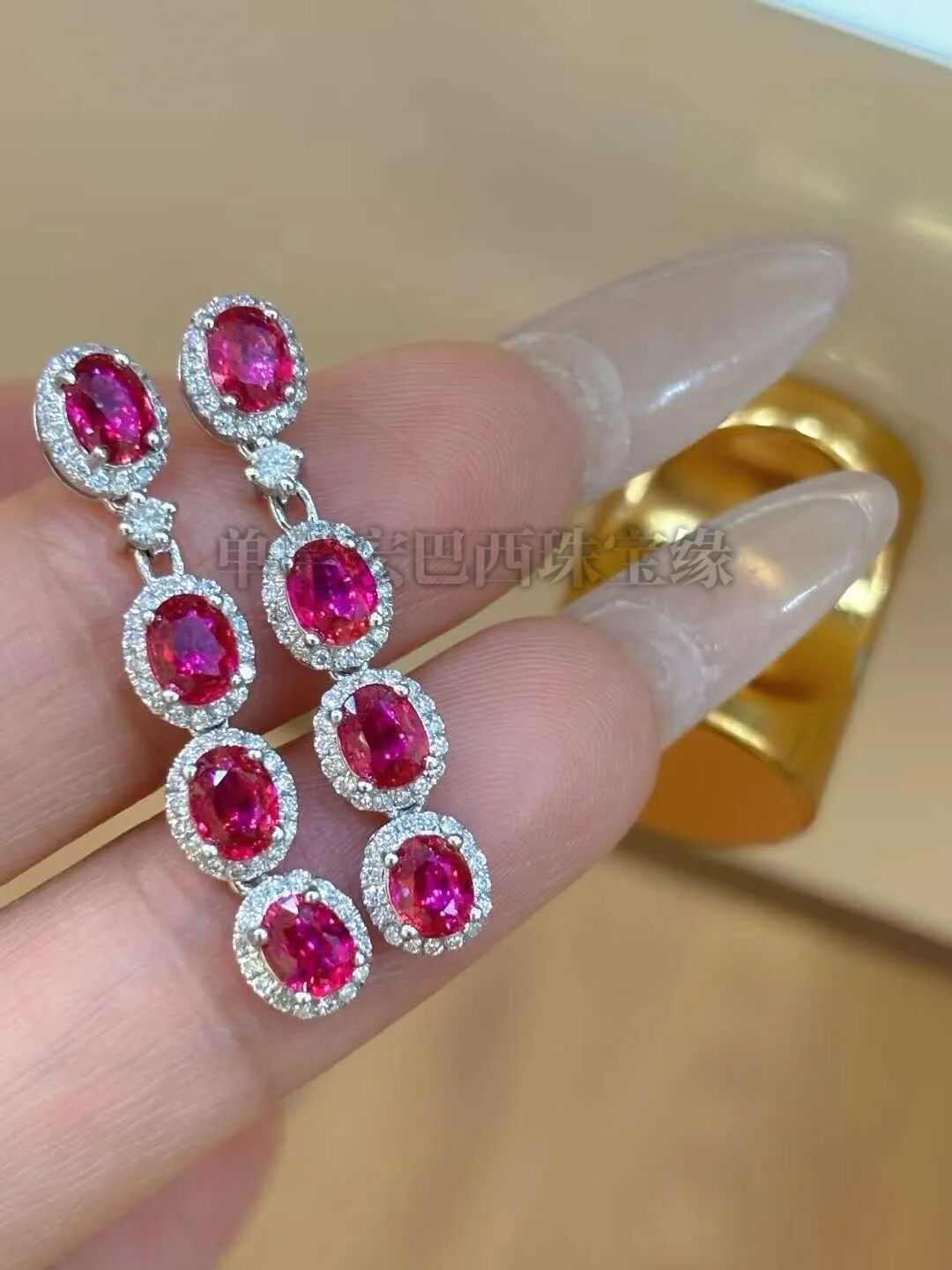 无烧红宝石耳饰。绝美鸽血红色,玻璃体晶体火彩都非常好,奢华贵气~PT铂金钻石镶