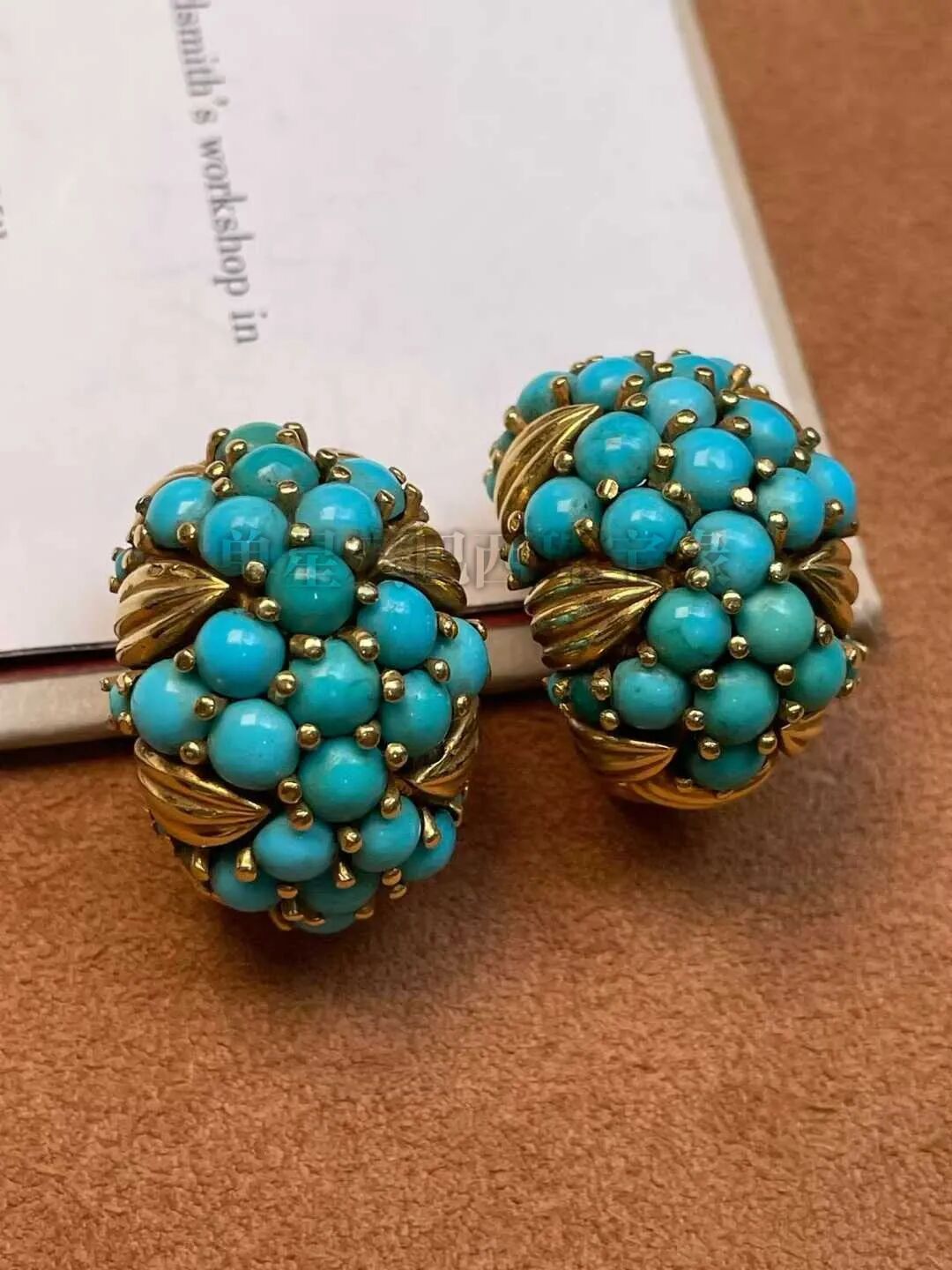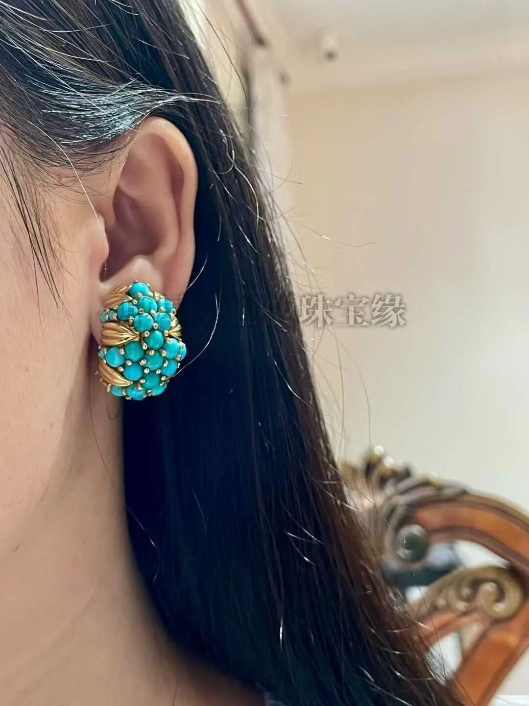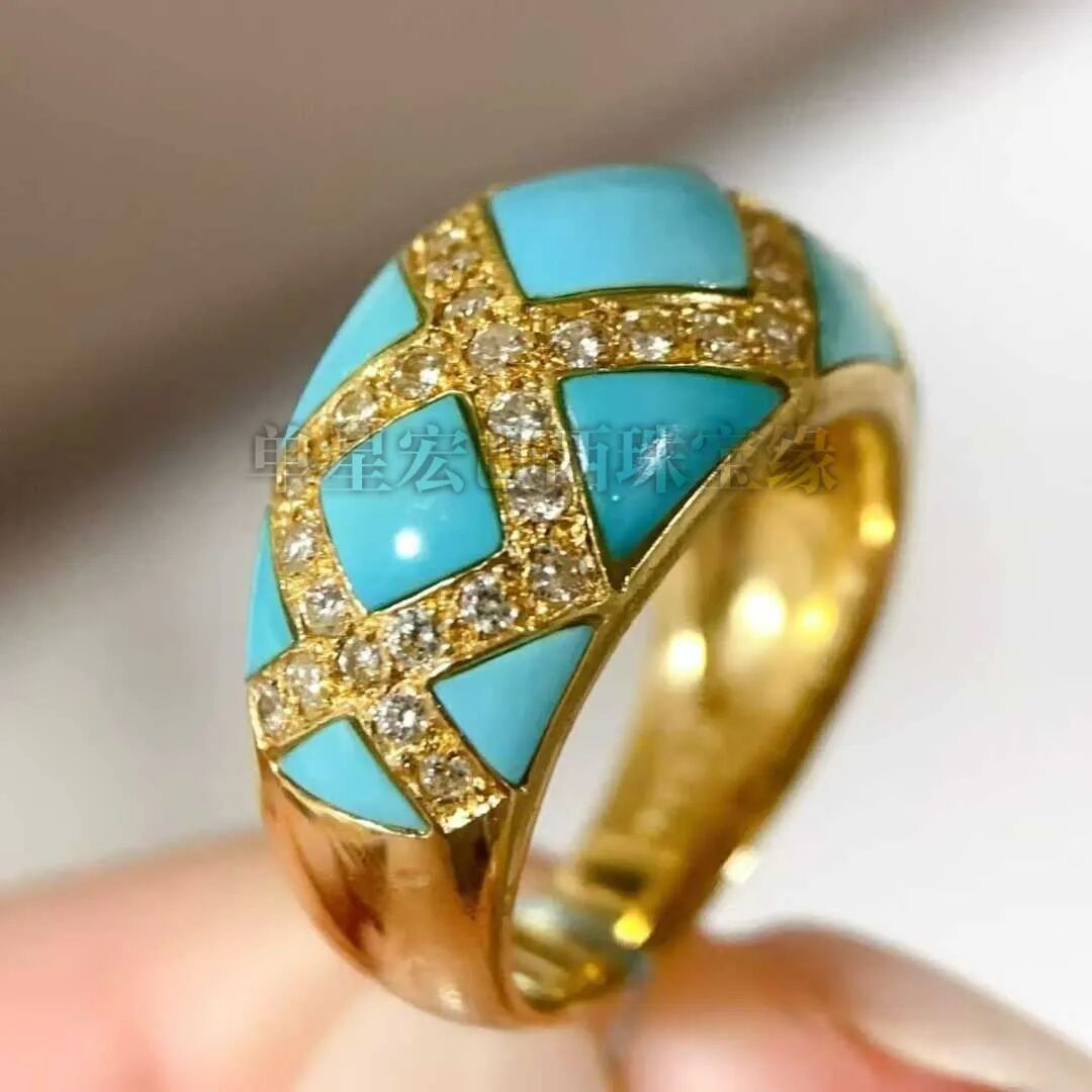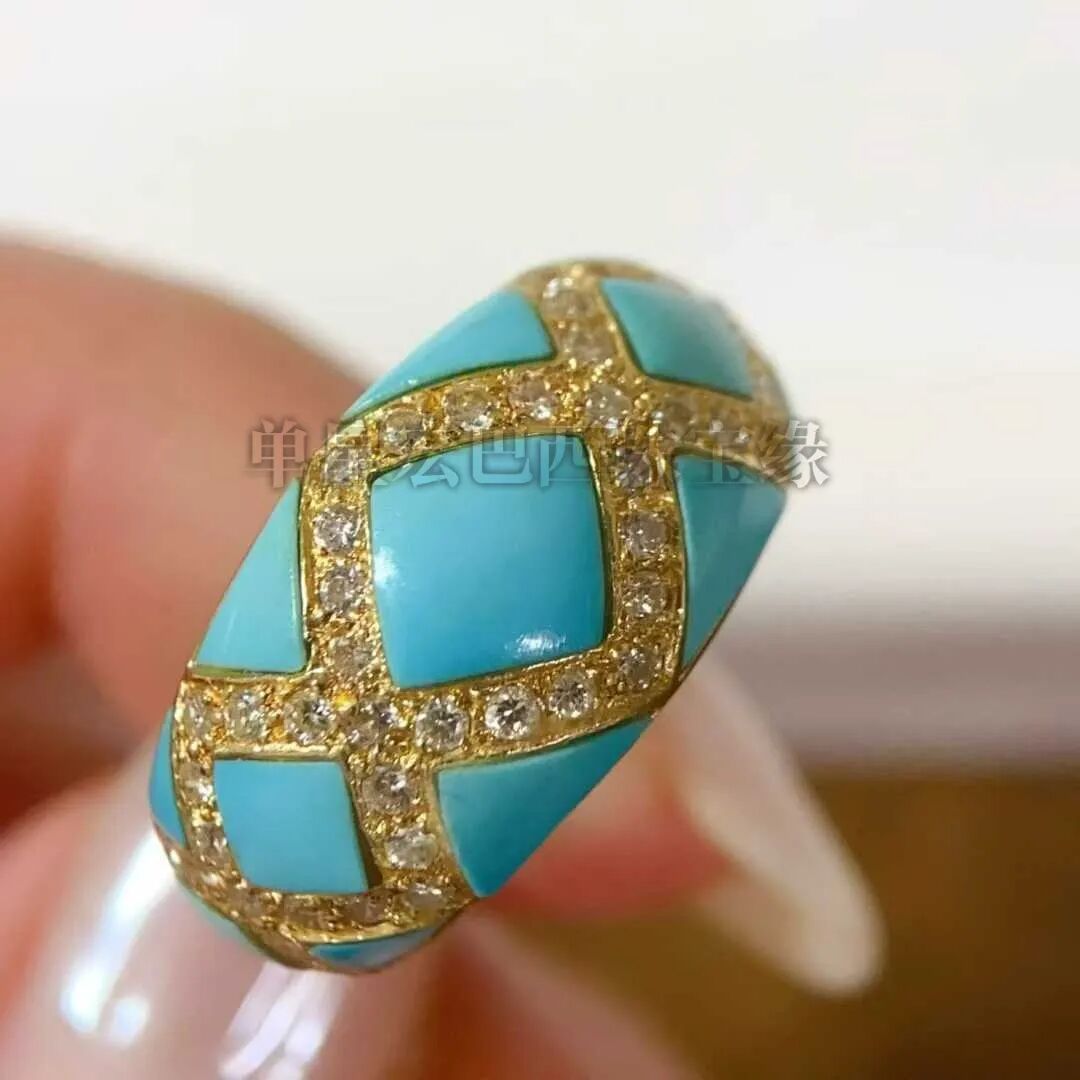 复古绿松石大体量,存在感强。立体穹顶造型饱满圆润,数十颗高瓷蓝绿松石以爪镶紧密排布,色泽清新柔和。