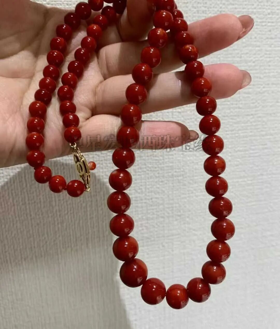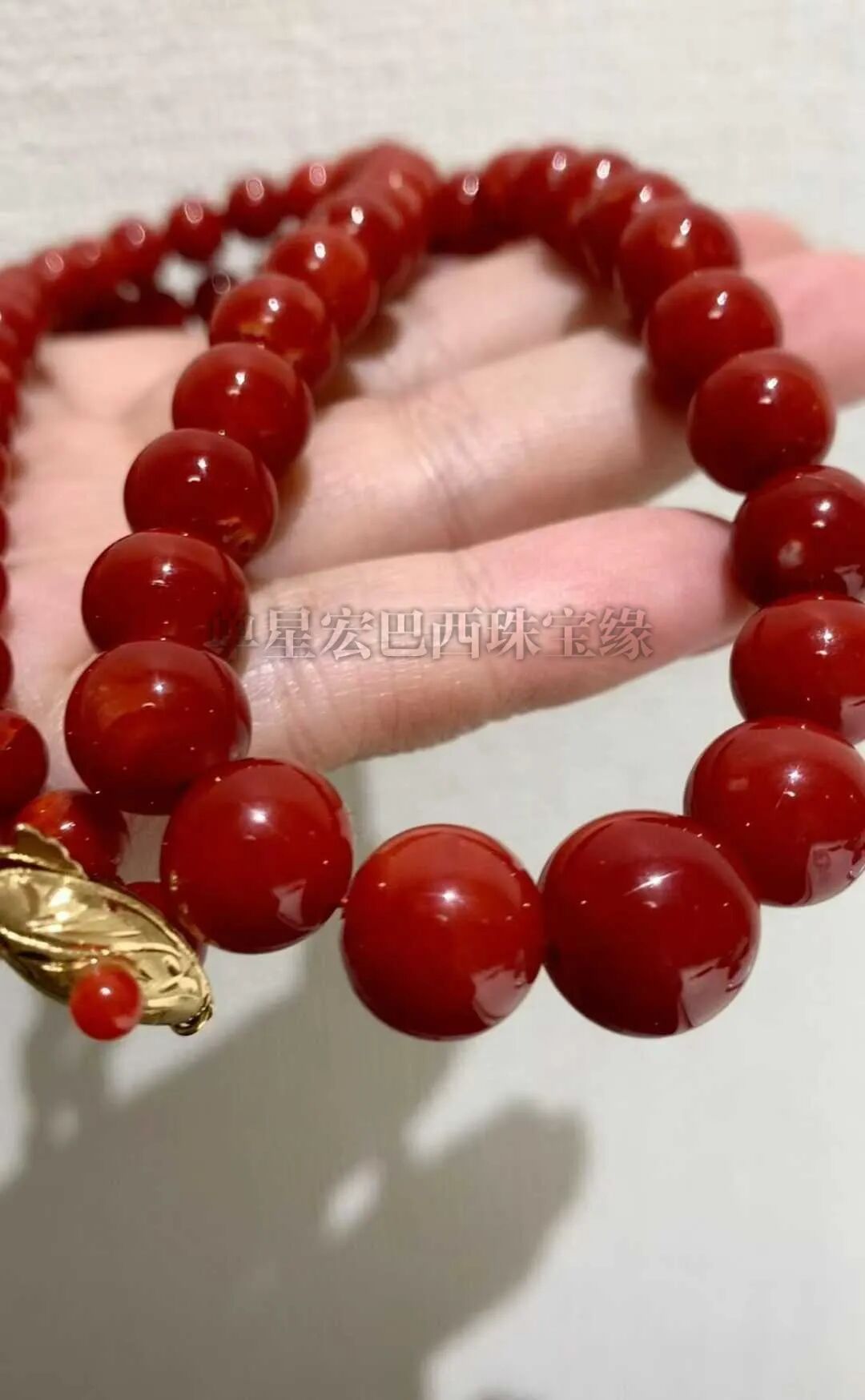 牛血红微白心 整体很干净。18K黄金珊瑚扣 颜色太漂亮了 瑕不掩瑜的一条极品