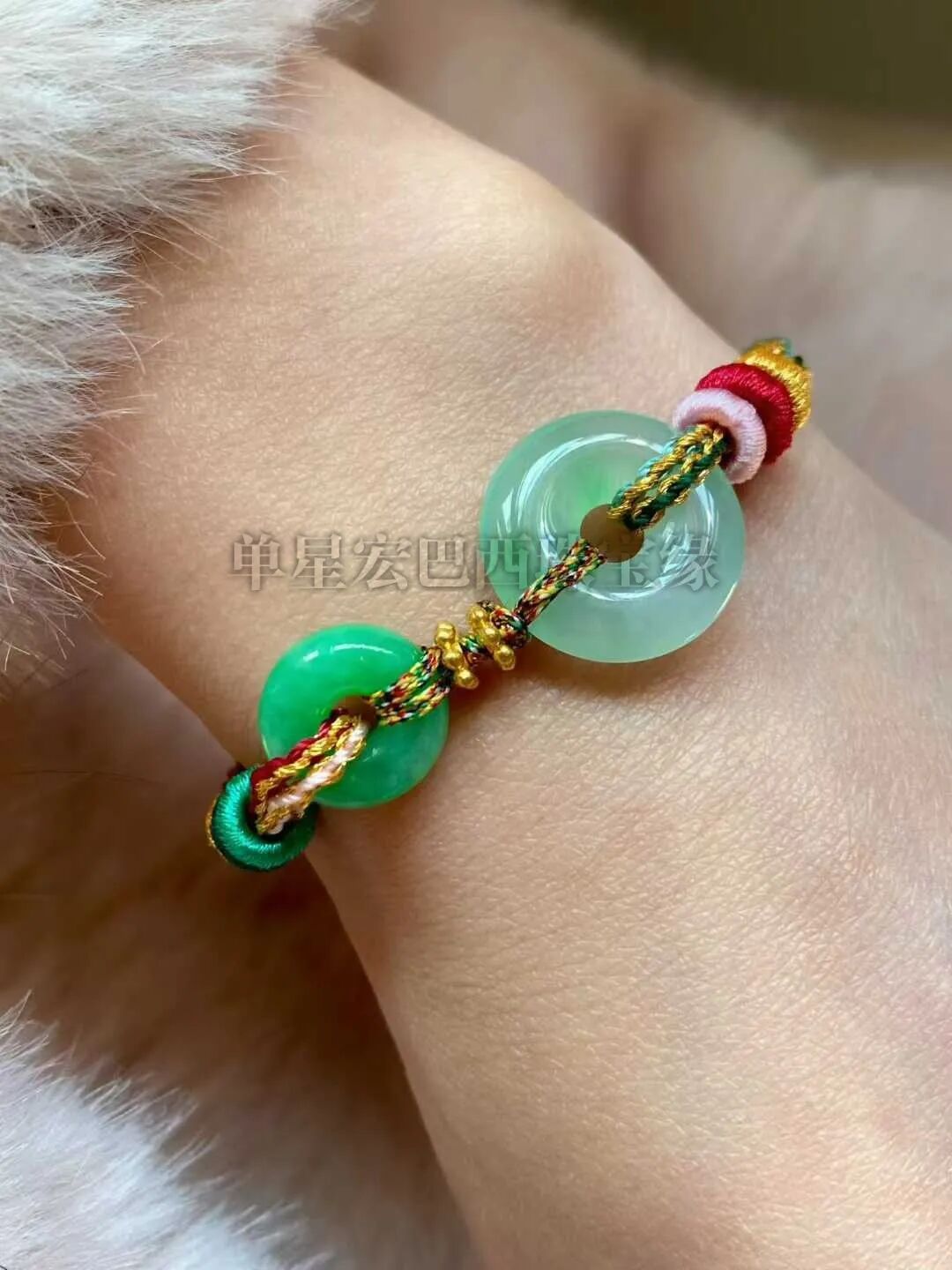 缅甸翡翠玉绳,岁月承安,双股多彩编绳,清新翠绿的小圆满,配件足金。