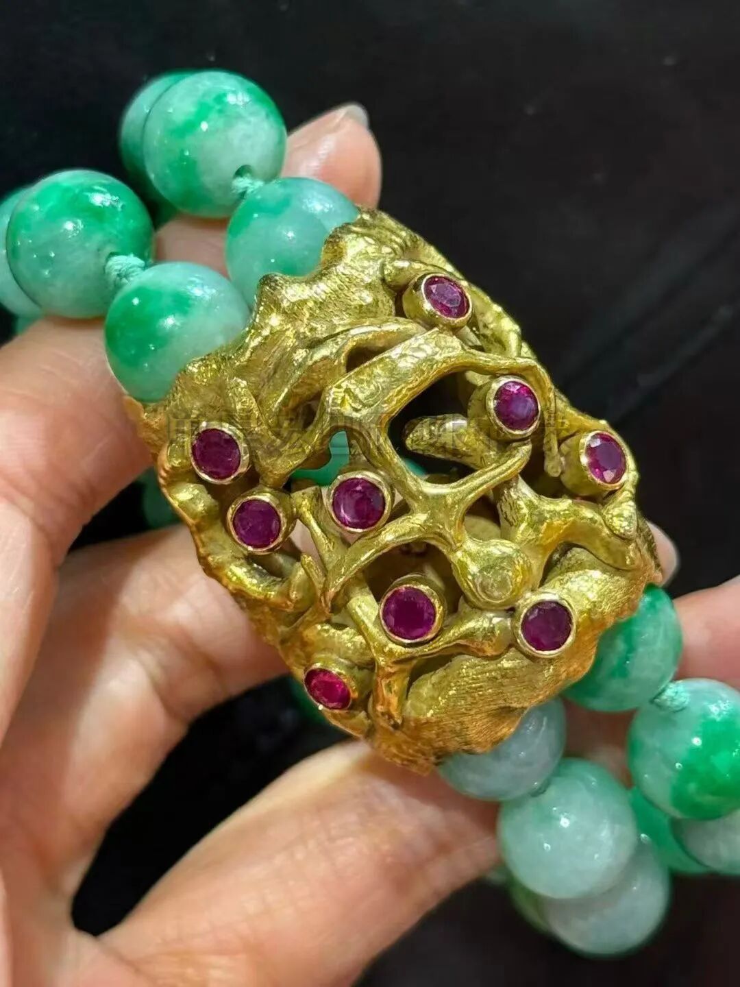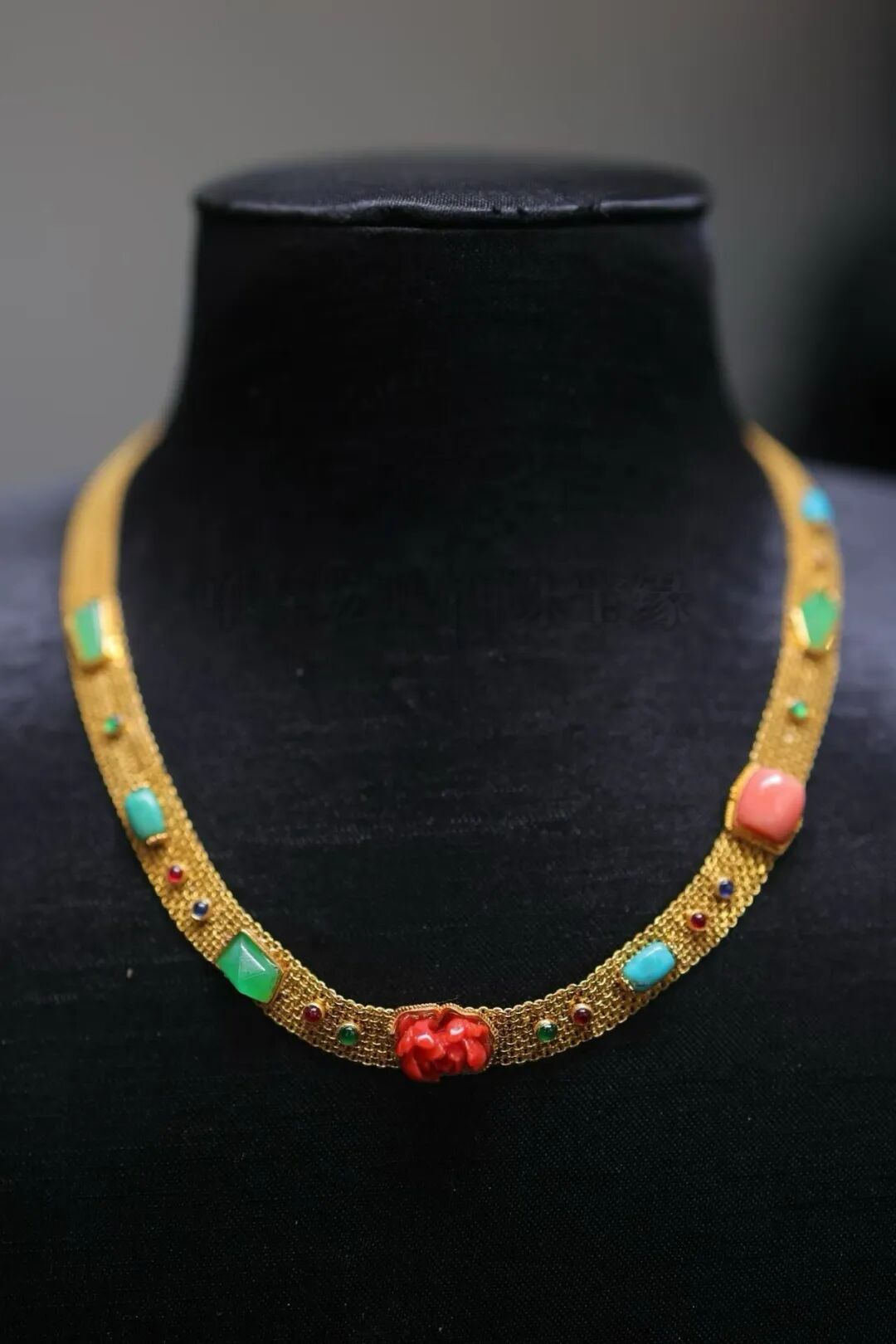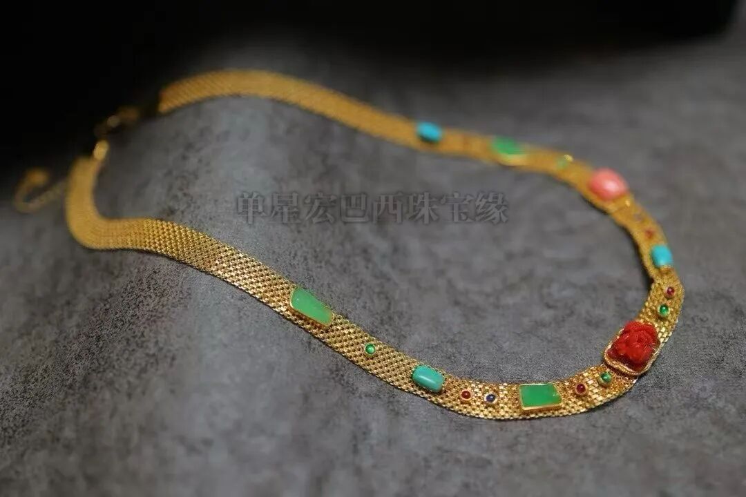 18k金古法金镶嵌天然珊瑚,翡翠,绿松,红宝石等多宝项链!上身气质感爆棚