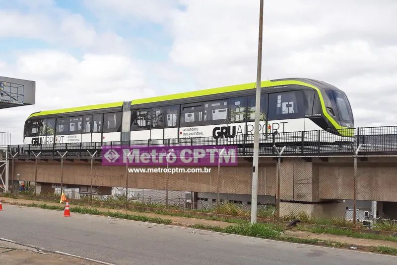 连接机场三个航站楼和CPTM13号线的PeopleMover系统将同时运行两辆车。OAeromovel“verde”circulandoemtestes(Rebu)绿色的Aeromovel正在进行测试